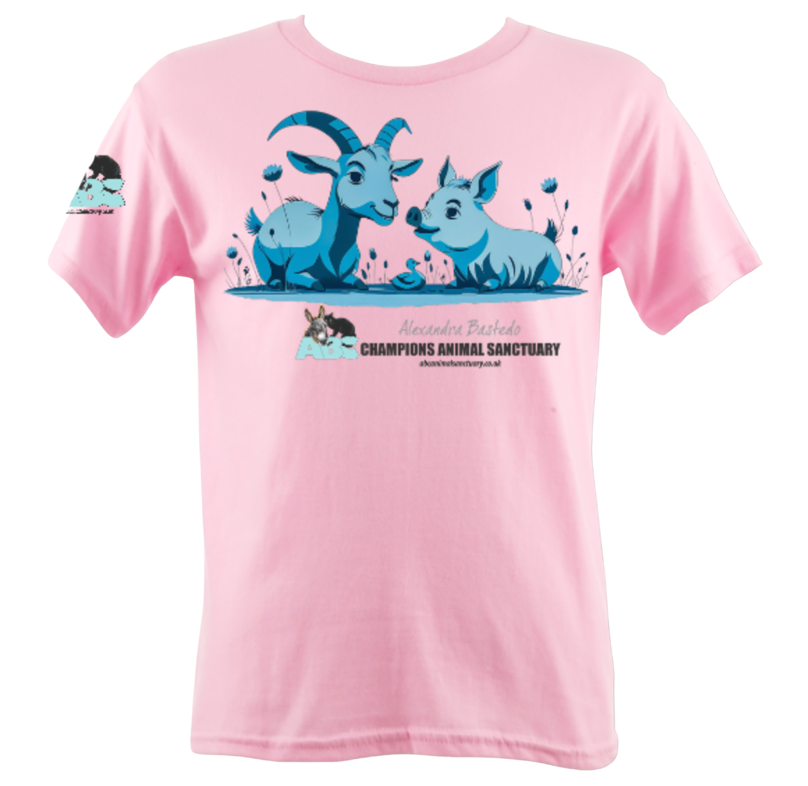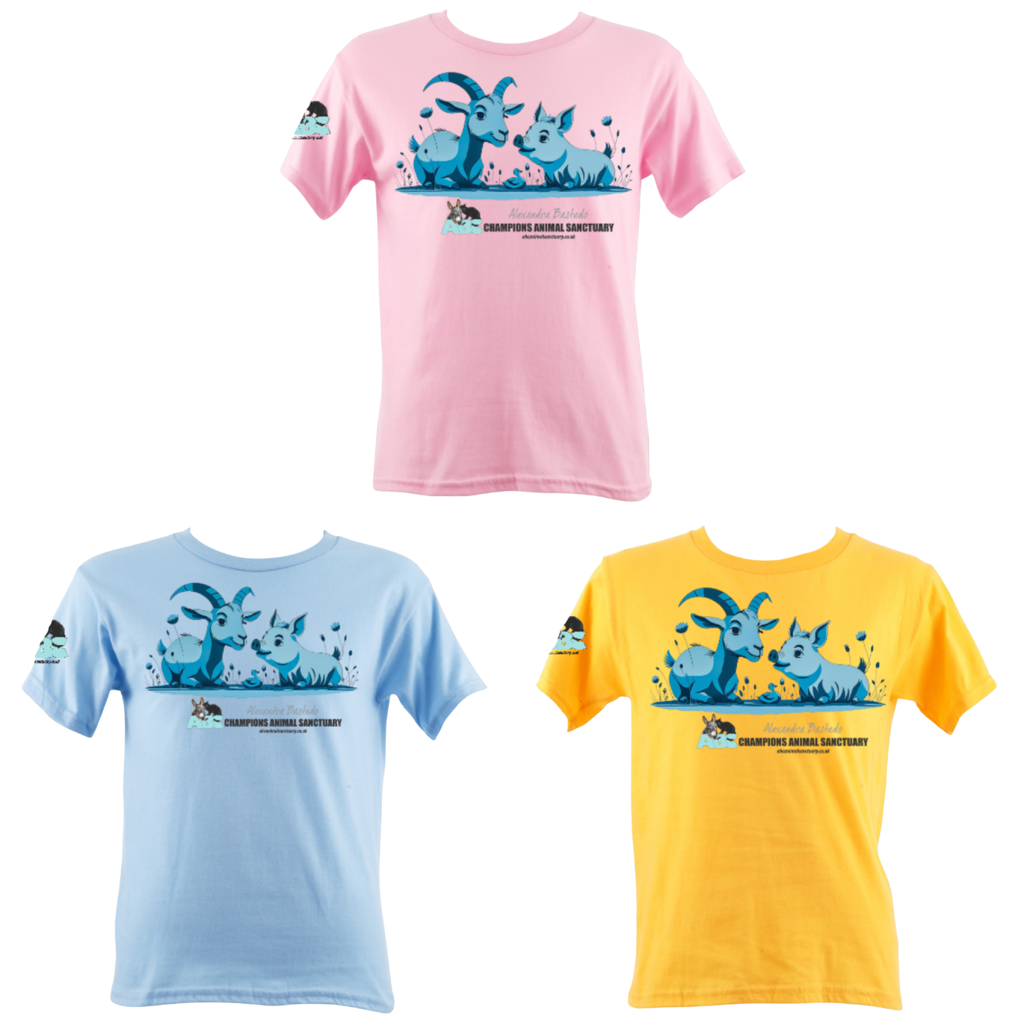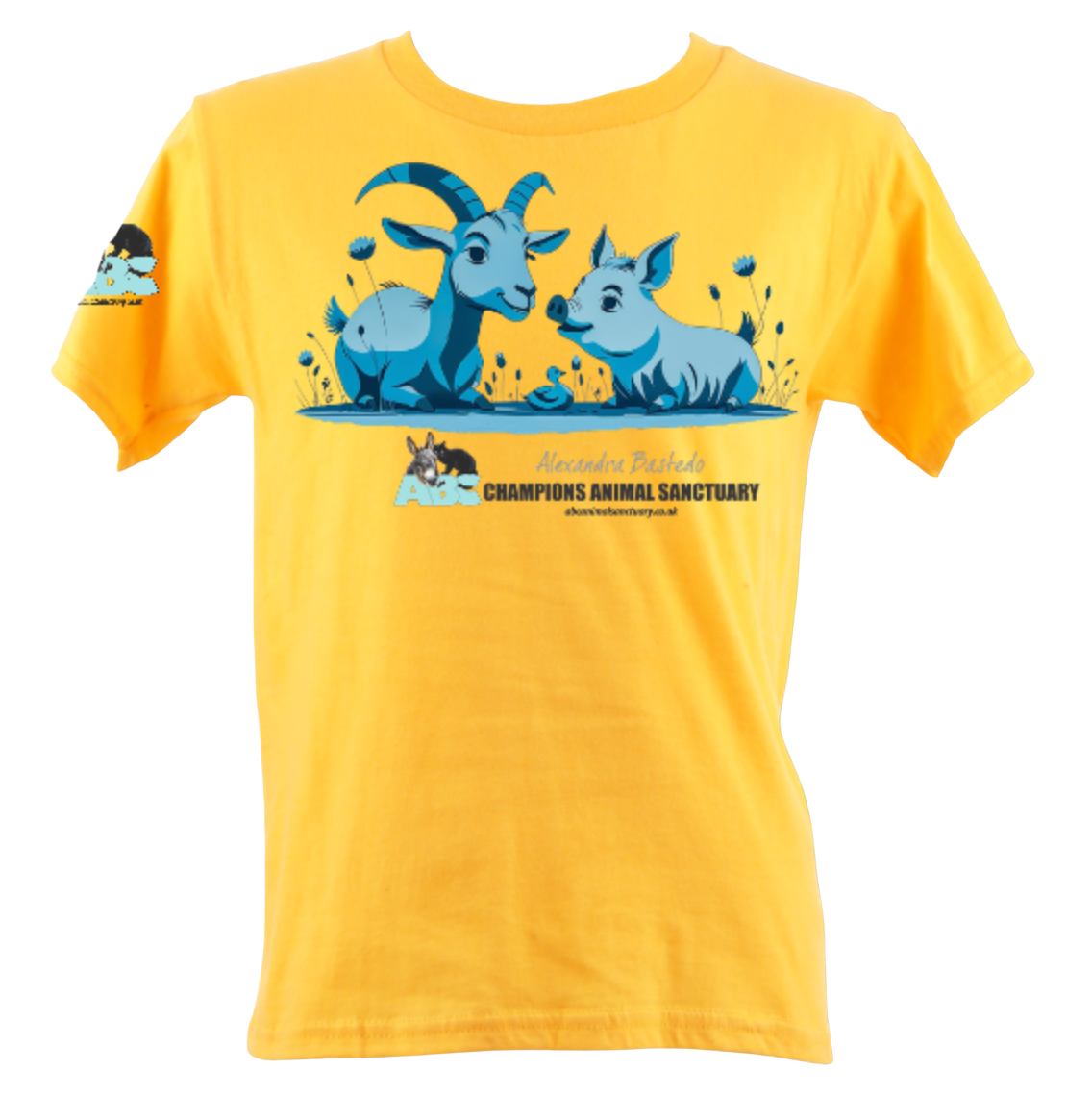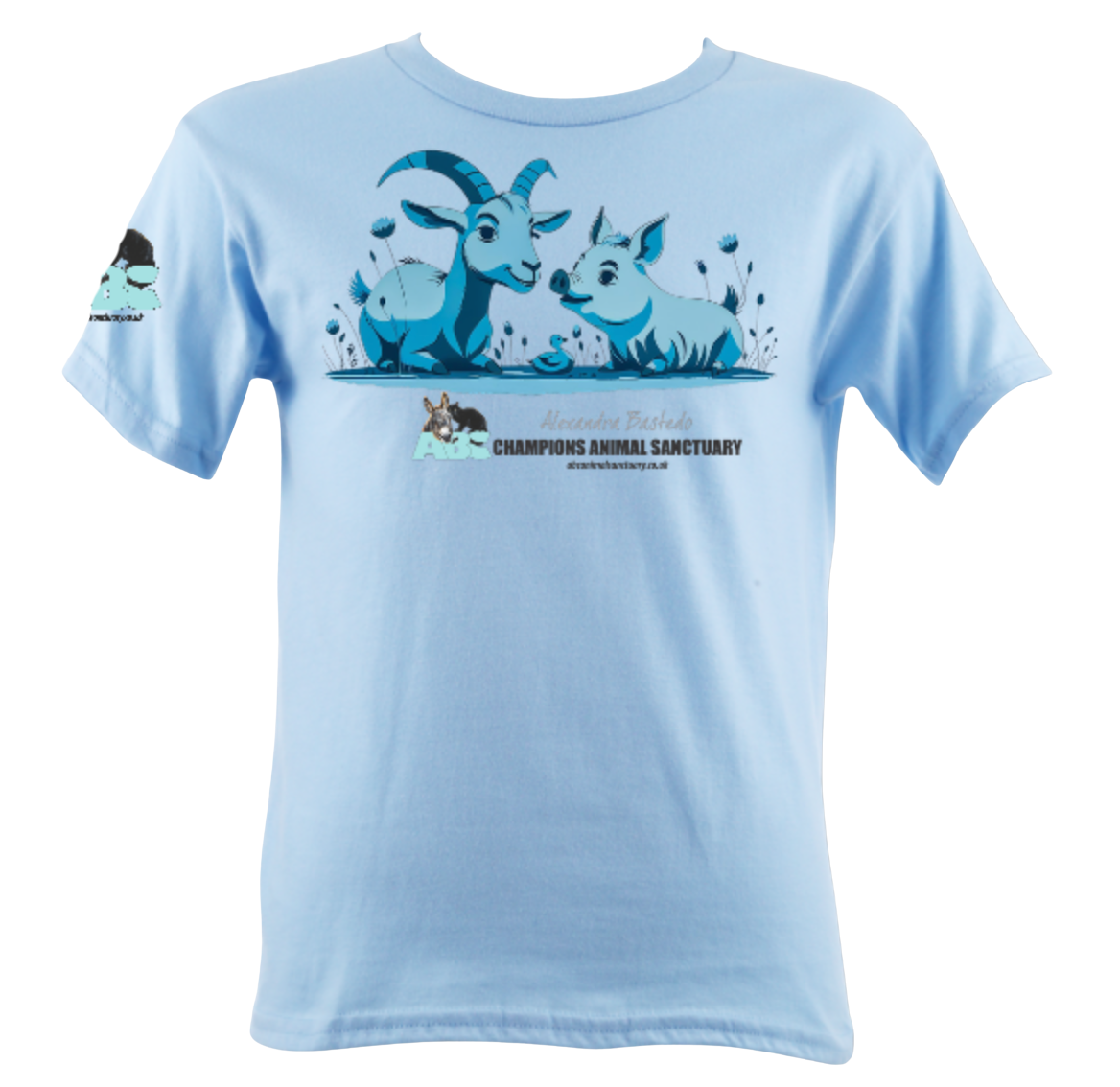 The ABC Animal Sanctuary Junior short-sleeved T-shirt with CARTOON design ( front only) is available in three vibrant colours and various sizes. By purchasing this shirt, you directly support the animals at the sanctuary.